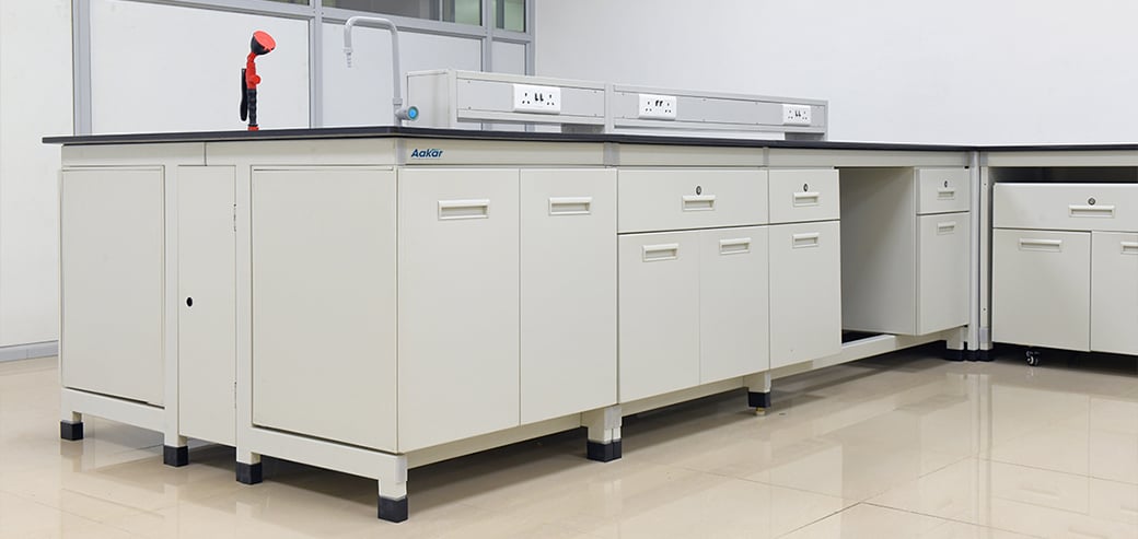 C-frame workbenches feature laboratory work stations mounted on a sleek C-shaped frame, optimizing floor space and enhancing productivity while maintaining functionality. Specifically designed for laboratory environments, the Aakar workbench with C-frame mounting offers a robust, adaptable work area. Its adaptable nature allows for customizable configurations, optimizing both vertical and horizontal space. These cutting-edge workstations excel in space utilization, durability, and customizable configurations, improving ergonomics and facilitating versatile applications. Vital for modern workspaces, they seamlessly blend adaptability with style." The C-frame workbench in laboratory settings are proven highly beneficial due to its unique design and functionality.